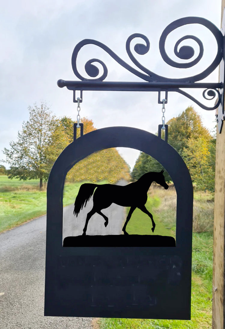 Our traditional ornamental hanging signs are designed to be nearly over-opulent. A signature piece, this hanging metal sign is sure to be admired by all your visitors! Handmade in our Sussex workshop from a 3mm mild steel, and finished in our black high-density polyethylene, this pub-style hanging sign brings an extra touch of class and grandeur to any property. Comes in rectangular or round sign shapes. Browse all our hanging Devon signs below.