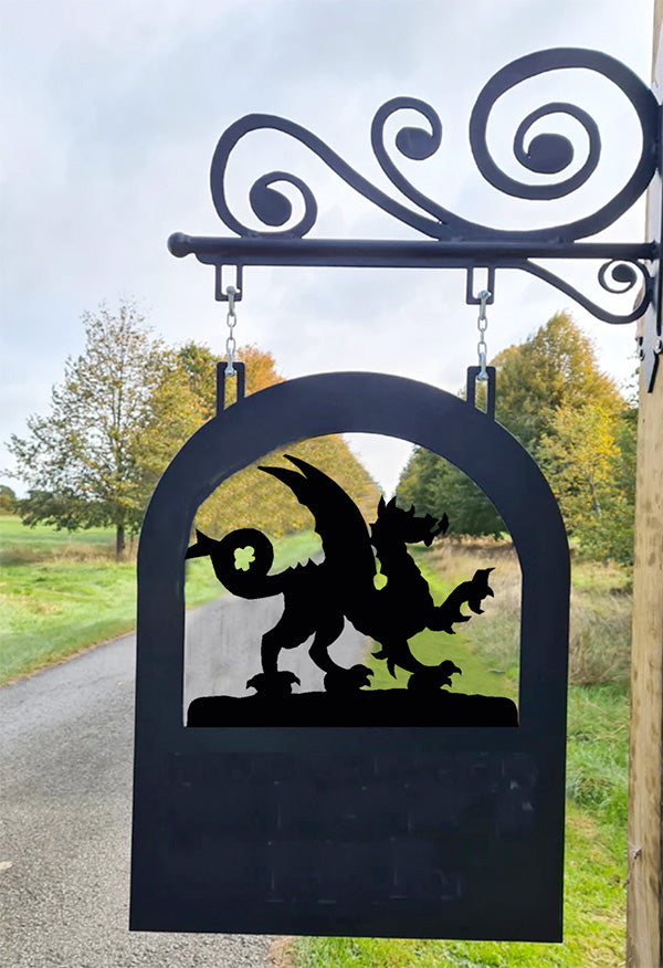 Our traditional ornamental hanging signs are designed to be nearly over-opulent. A signature piece, this hanging metal sign is sure to be admired by all your visitors! Handmade in our Sussex workshop from a 3mm mild steel, and finished in our black high-density polyethylene, this pub-style hanging sign brings an extra touch of class and grandeur to any property. Comes in rectangular or round sign shapes. Browse all our hanging Devon signs below.