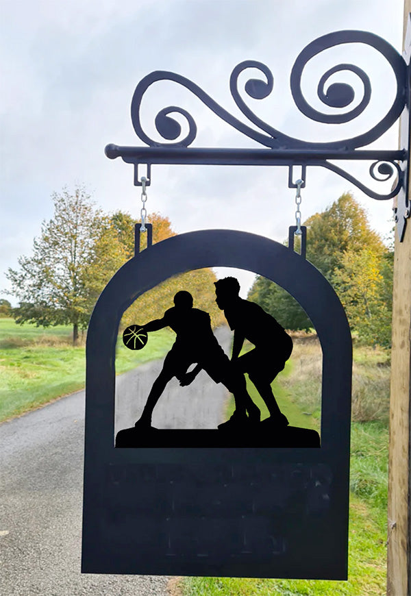 Our traditional ornamental hanging signs are designed to be nearly over-opulent. A signature piece, this hanging metal sign is sure to be admired by all your visitors! Handmade in our Sussex workshop from a 3mm mild steel, and finished in our black high-density polyethylene, this pub-style hanging sign brings an extra touch of class and grandeur to any property. Comes in rectangular or round sign shapes. Browse all our hanging Devon signs below.