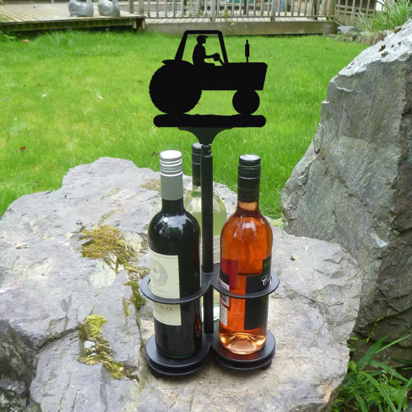 Just the thing for the wine lover in your life: the custom metal wine bottle holder, aka the wine wizard. This tabletop wine rack holds three bottles of wine or spirits, making it the perfect thing to bring out during a party! Each wine carrier stands on a heavy clover-shaped base with ball feet, revolving effortlessly for selection. It looks great on the table and is sure to be a talking point. Browse all metal wine bottle holders below.