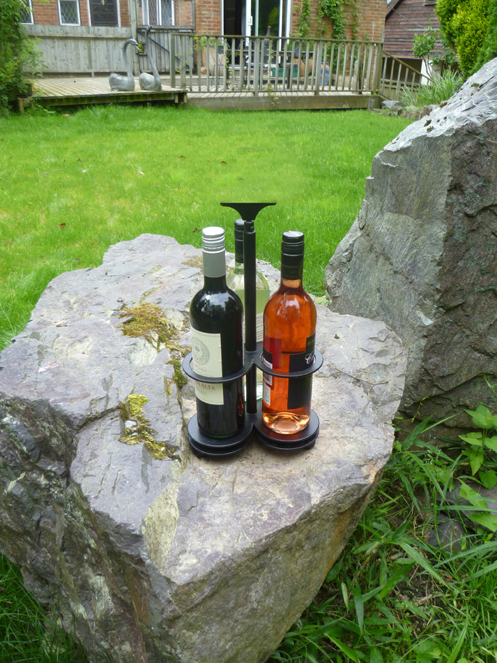 For the man or woman who has everything I give you the Wine Wizard. This table top wine rack holds three bottles of wine or spirits (not supplied). It stands on a heavy clover leave shaped base with ball feet and revolves effortlessly for selection. It looks great on the table and is sure to be a talking point.